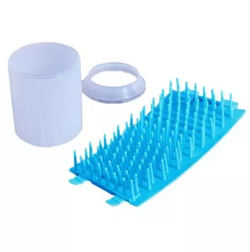 My chihuahua reluctantly agreed to let my grandson clean his paws with this paw cleaner. It consists of a sturdy plastic cup with soft, silicone fingerlets inside for cleaning. Just fill the cup about 3/4 full with warm soapy water and put the dog’s paw in a few times. The paw comes clean in a jiffy. Repeat on the other 3 paws. It can be used on a little or a big dog. It’s portable so it’s good to take camping, to the park, or to use at home.